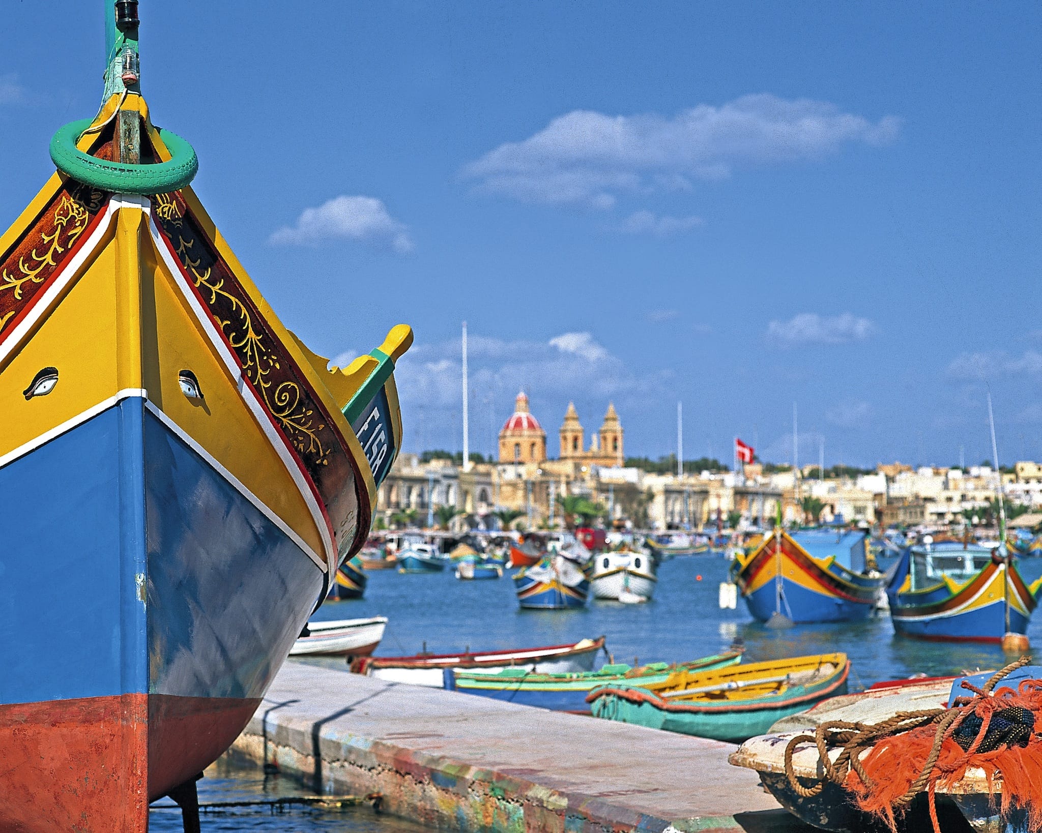 Halt im charmanten Fischerdorf Marsaxlokk. Bunte Fischerboote, traditionelle Luzzus mit ihren fröhlichen Augenmalereien und das lebendige Treiben am Hafen vermitteln ein authentisches Stück maltesischer Lebensart.